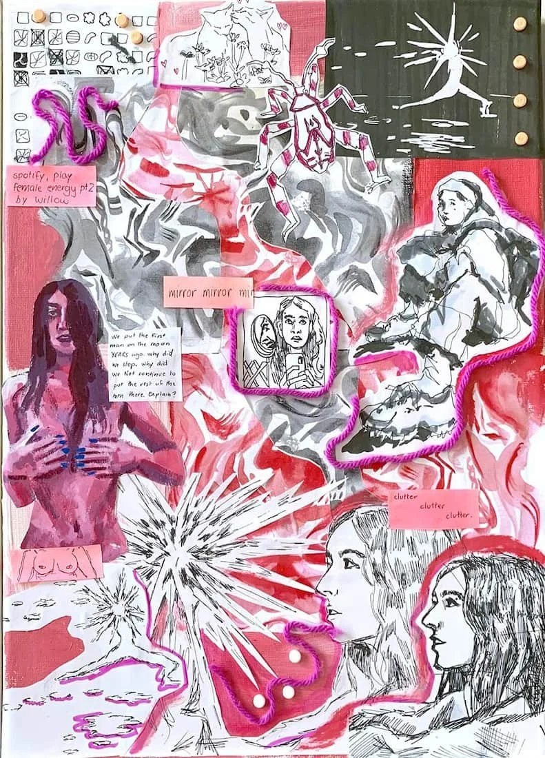 Showing the evolution of an idea — through sketches, materials, and final composition — helps reviewers understand your creative process as powerfully as the finished work.