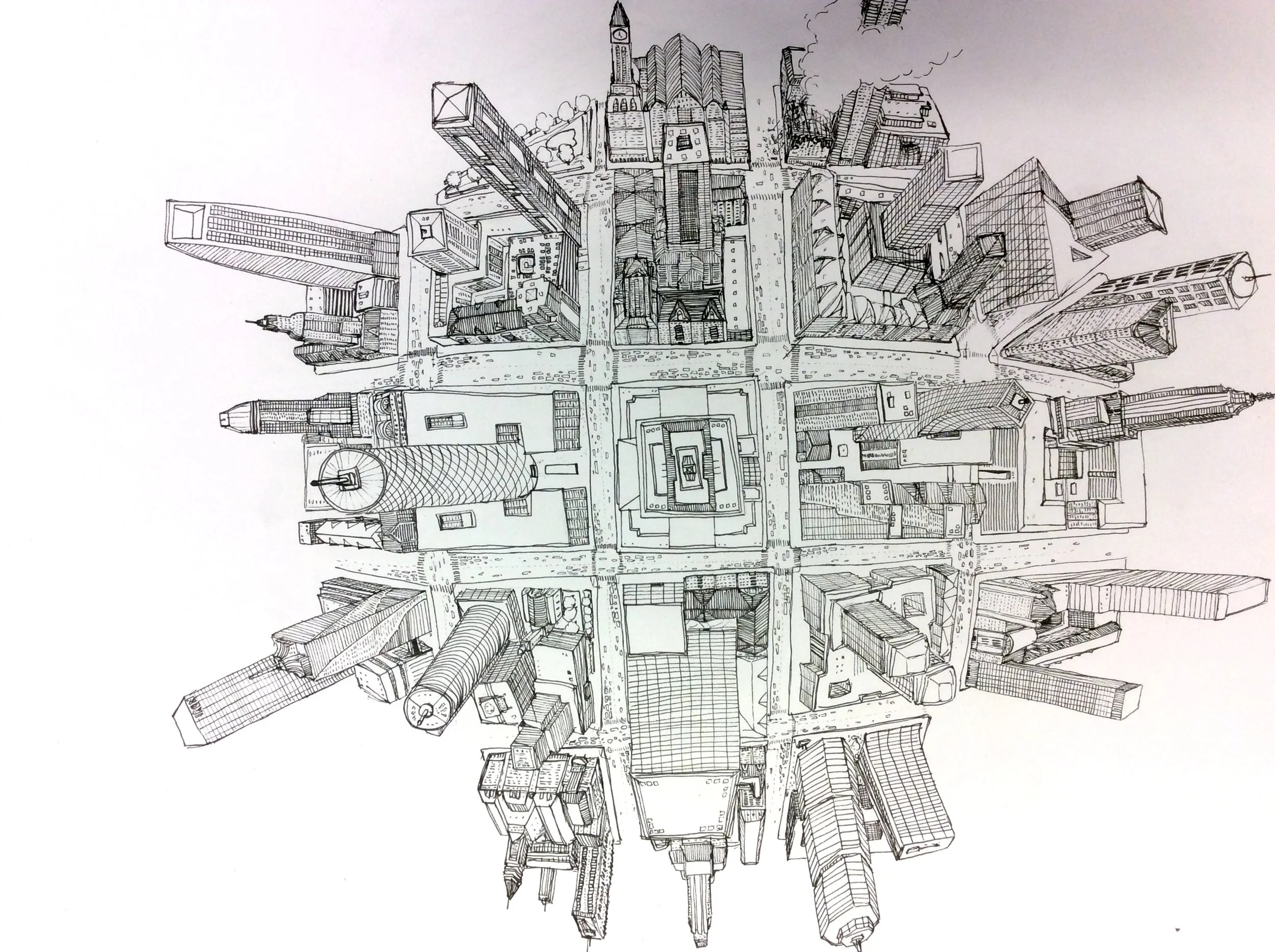 This technical pen drawing presents a bird’s-eye cityscape in perfect perspective, radiating outward in a circular layout. The precision in architectural form, structural detail, and consistent vanishing points showcases exceptional draftsmanship and spatial reasoning. This piece reflects a mastery of line control and an advanced understanding of urban design—an ideal portfolio asset for architecture, design, or fine art programs.