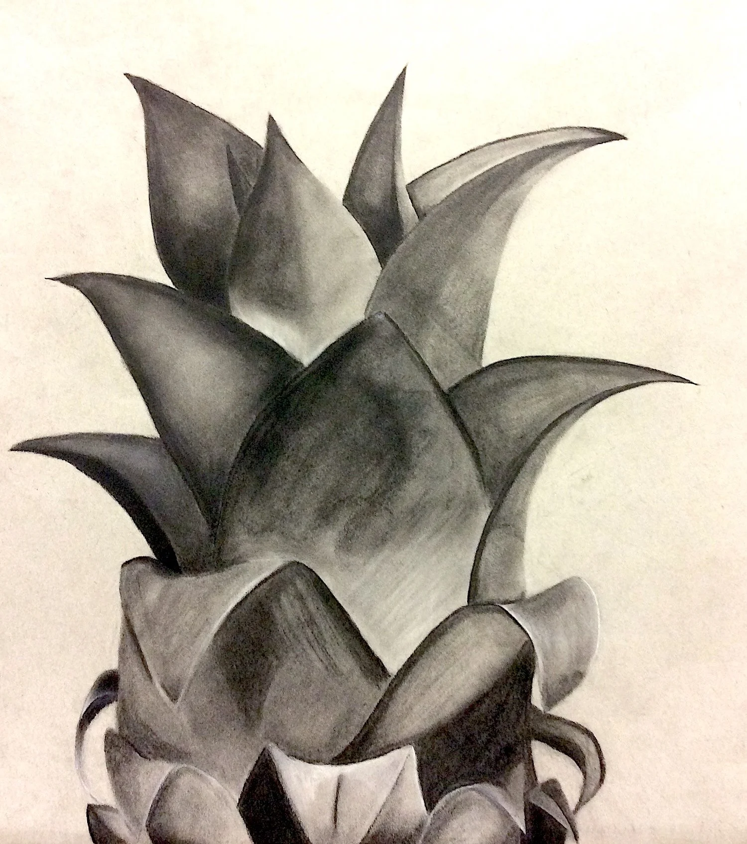 This charcoal drawing captures the intricate texture and structure of a pineapple crown with dramatic lighting and tonal contrast. The composition isolates the form, turning a simple organic object into a sculptural study of shape, shadow, and negative space. It’s a clean, focused piece that demonstrates precision, patience, and control—all traits colleges appreciate in observational portfolio work.