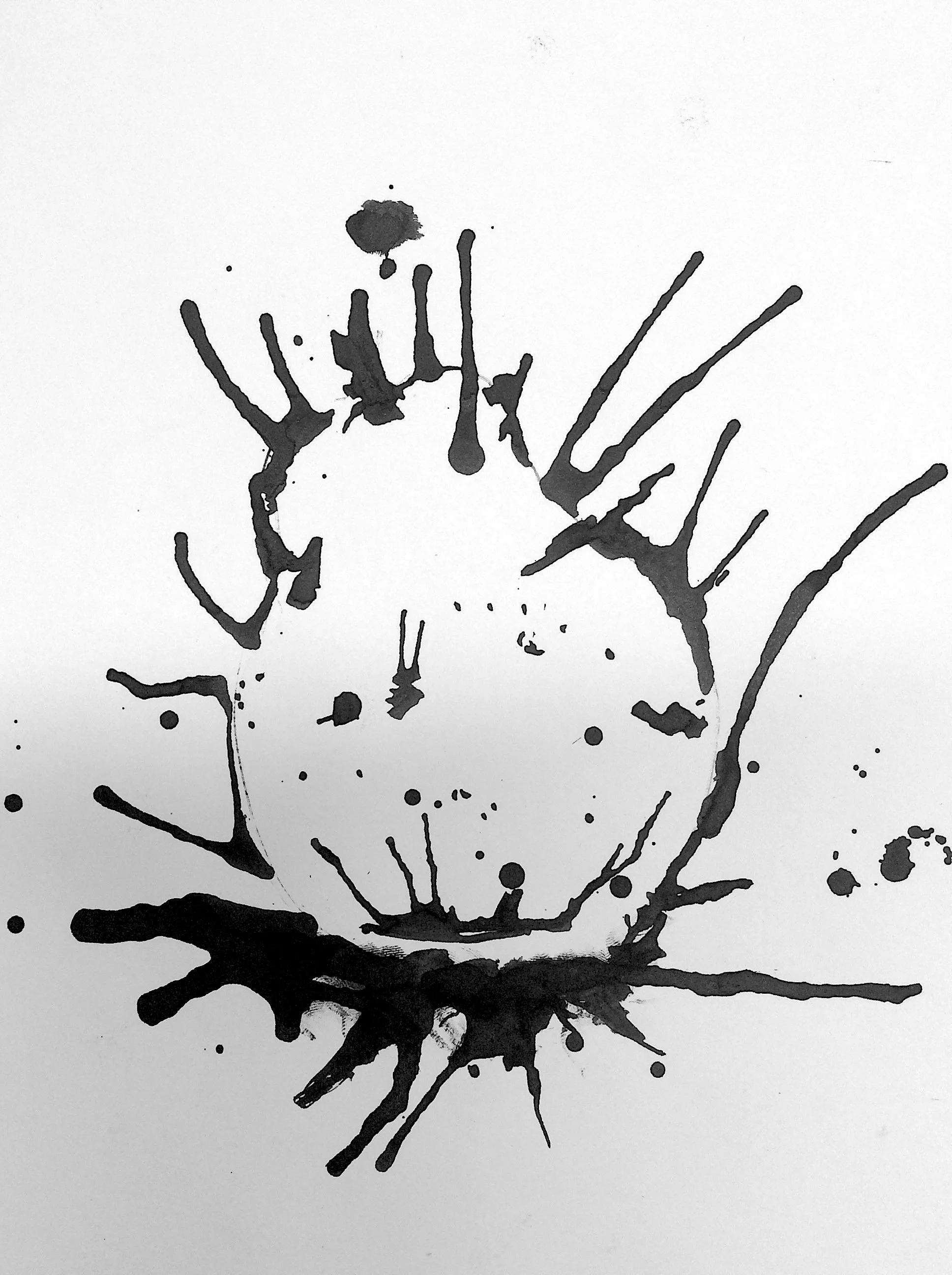 This abstract ink drawing uses intentional splatter and mark-making to convey raw emotion and spontaneity. While minimalist in execution, the radial energy and facial suggestion invite interpretation—blurring the line between expressive gesture and subconscious character. A bold example of conceptual drawing that embraces experimentation and intuitive process, reflecting creative confidence and risk-taking.